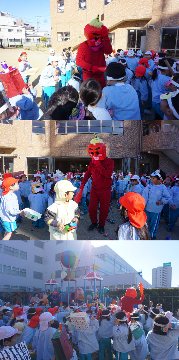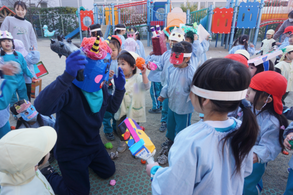 自分で考えて作った節分グッズを身に付けて園庭に出陣!!