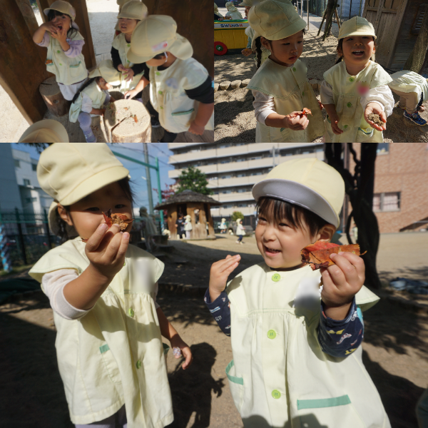 秋が深まり、園庭に沢山の落ち葉が見られるようになったね🍂